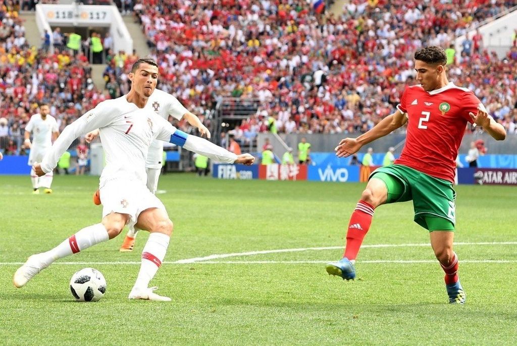 2018年世界盃小組賽第二輪葡萄牙1:0摩洛哥:摩洛哥(右)兩場比賽的場面均占據優勢壓著對方打,但運氣實在背,二連敗成為本屆世界盃最早出局的球隊。