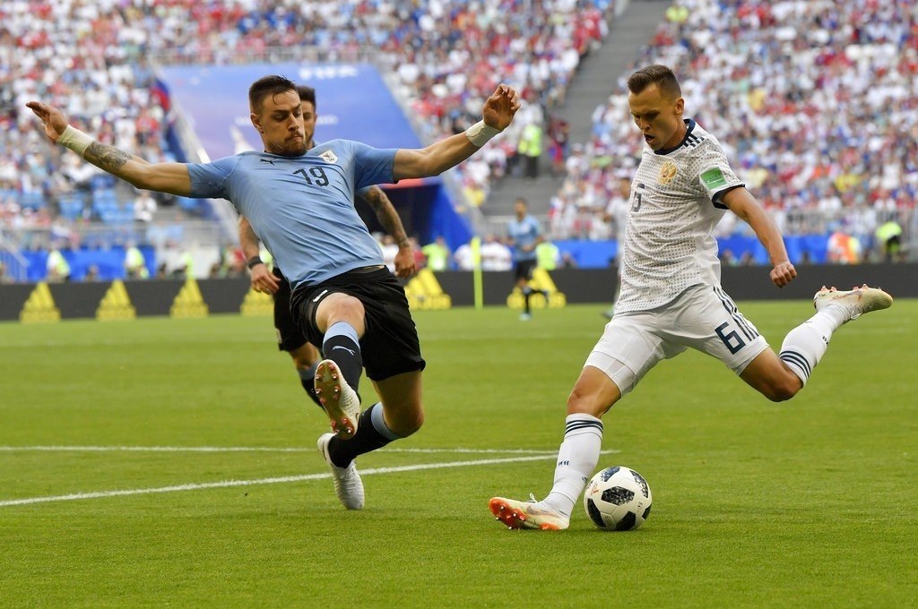 2018年世界盃小組賽第三輪烏拉圭3:0俄羅斯:俄羅斯的切里謝夫(Denis Cheryshev,右)。