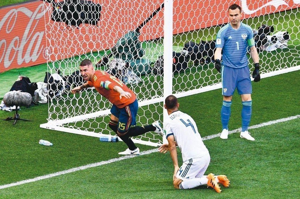 2018世界盃16強淘汰賽西班牙PK3:4俄羅斯:西班牙與地主俄羅斯十六強賽,俄羅斯伊格尼許夫奇(中)開賽十二分鐘擺烏龍,送西班牙一球。
