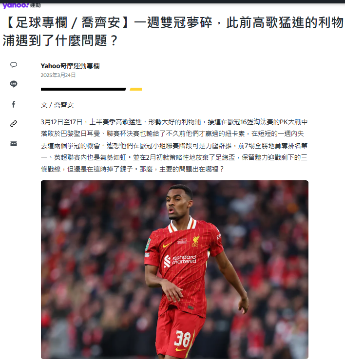 【Yahoo奇摩足球專欄】一週雙冠夢碎,此前高歌猛進的利物浦遇到了什麼問題?