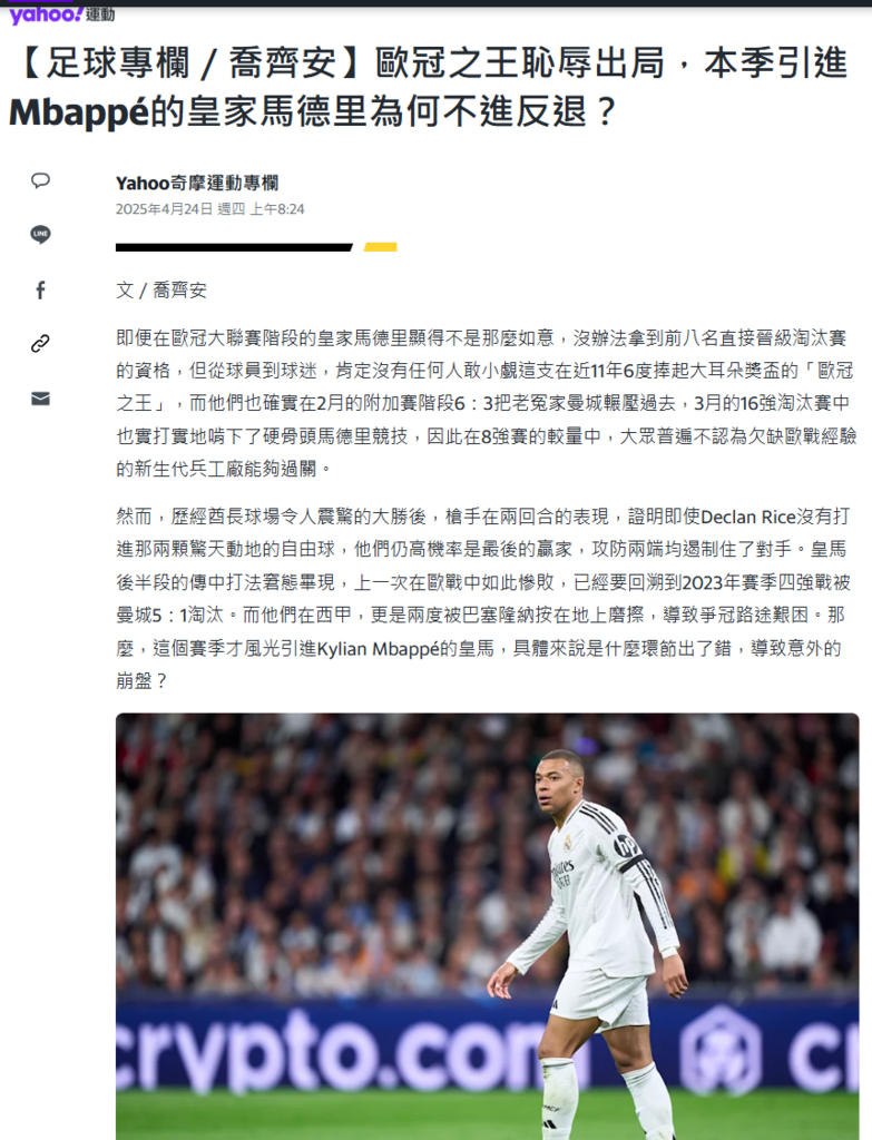 【Yahoo奇摩足球專欄】歐冠之王恥辱出局,本季引進Mbappé的皇家馬德里為何不進反退?