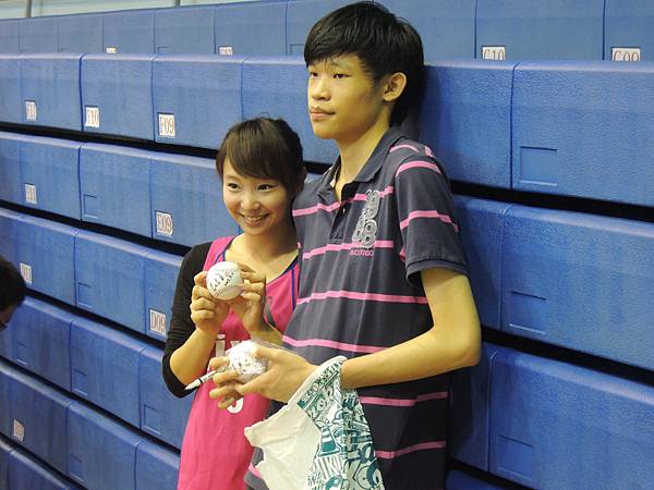 噹噹~~賽後看到大批男生觀眾湧過去,就知道是所有人最期待的簽名&合照時間了!!排了排隊,等到終於跟卓君澤本人說到話時,沒想到自己依舊緊張到心臟都快蹦出來了!雖然已經在愛爾達體育台擔任球評轉播比賽時算是經歷過一種大場面的幾次考驗了,但跟大美女主播拍照說話還是沒有那麼容易的事情啊...甚至都不好意思從頭到尾直視著卓卓講話,唉實在太害羞啦...這點自己仍需要多加鍛鍊><
