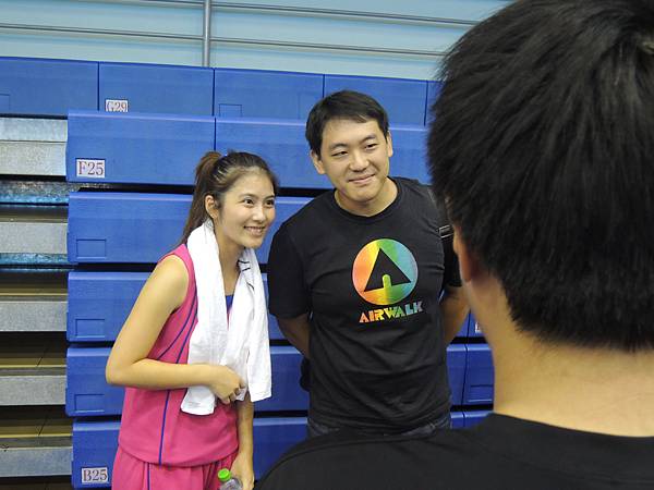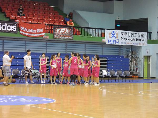 帶領這支亮麗粉紅軍團的,就是緯來體育台觀眾們也很熟悉的張繼元主播啦!現場可以看到他本人身材高大、壯碩!同時,在早前上一場球中,我也有看到在場上奔跑的高名賢製作人、在場邊看到在聊天的球評文大培、被鄉民稱為「糗爺」的李亦伸等這一年完整收看NBA球賽下來相當熟悉的人物。但最可惜的就是目前國內我最欣賞的主播,有臉蛋有熱血有專業的張立群沒有在現場,不然一定要過去跟他打個招呼,告訴他:「我真的好喜歡聽你播報的比賽啊!」^^b