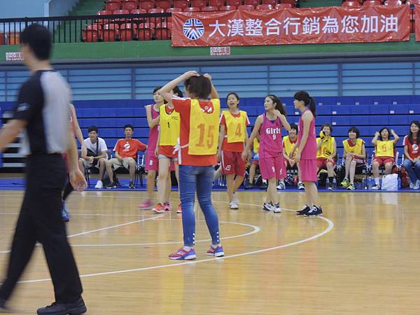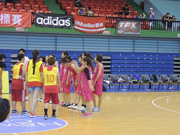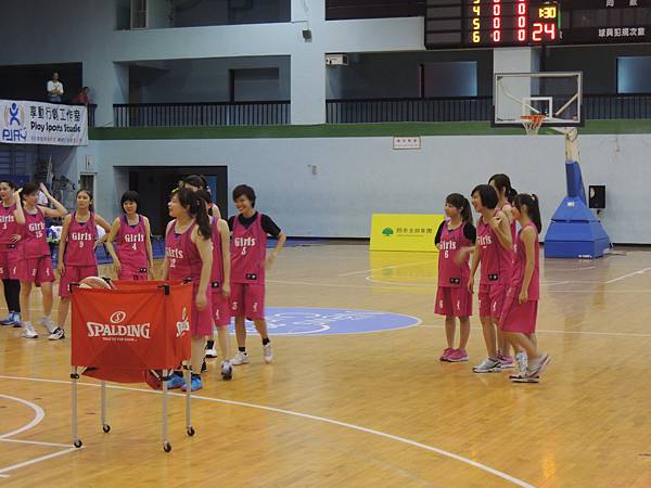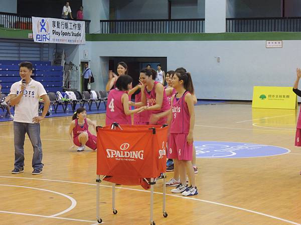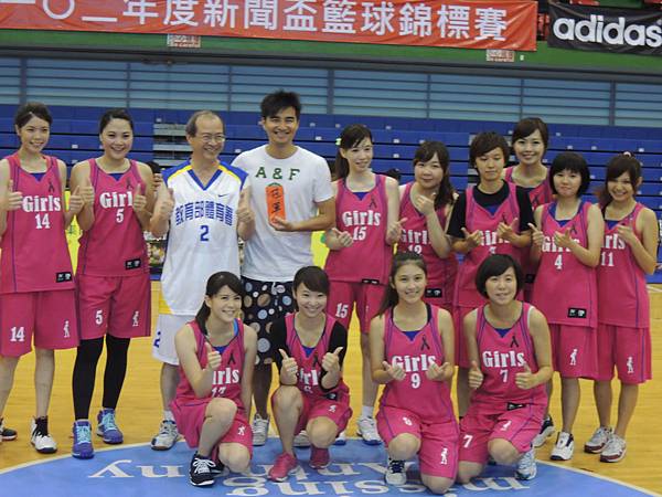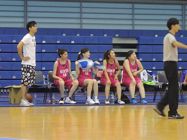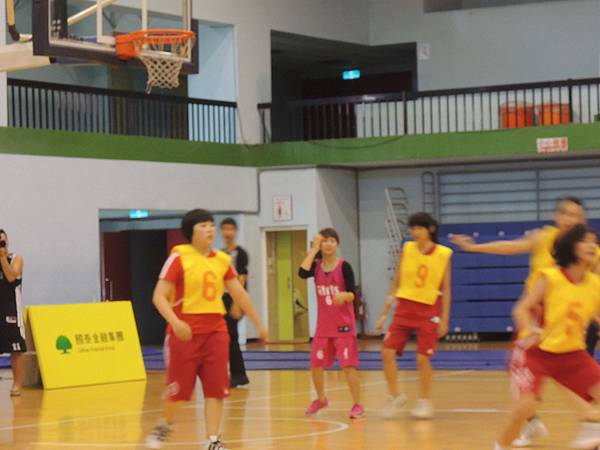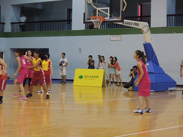 中場休息時間,主辦單位也舉辦了兩隊的罰球大賽,兩隊每個球員輪番上來罰球,每個人有兩個投籃機會,如果兩次都沒進就被淘汰。看看誰能剩下比較多人!結果記者隊就是勝方,也看得出其實投籃能力都不會遜色的!把握她們排隊等罰球的時間,從側面圖這樣來比較,就可以發現佳宜是有多麼地嬌小可愛了吧XDD 全場最小隻的女孩耶!