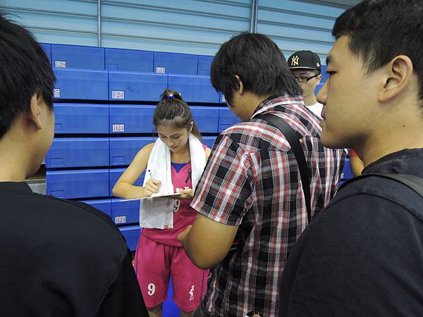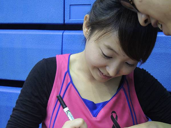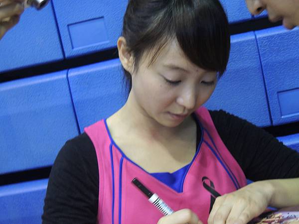 對話大概就這樣,畢竟還有許多人在排隊,而且我實在太害羞了...整個連在合照時都還有點緊張發抖呢...所以沒有更多聊一點哈哈有點遺憾。雖然是學妹還是不好意思亂攀關係裝太熟啊~只可惜沒有再跟母親是國家女足隊國腳的卓卓學妹再多聊到一點我的足球水準與工作,希望下次還有機會!卓卓、佳宜都很大方,不管是單獨讓人拍照、合照、簽名都是來者不拒,盡情地釋放微笑魅力,現場也宛如粉絲會一般,氣氛熱烈。直到大家都簽完後,才看到卓卓默默地坐到觀眾席上講電話、看下一場比賽。...雖然可能不是打給他,但男性同胞們果然都還是很羨慕鍾承佑這傢伙啊!!!Q^Q